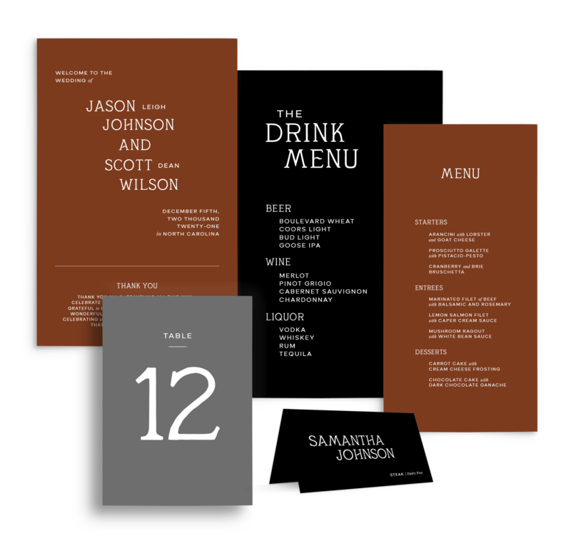 Photos and mockups of past E+W couples' wedding stationery and how they chose to customize the Manhattan design.