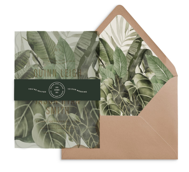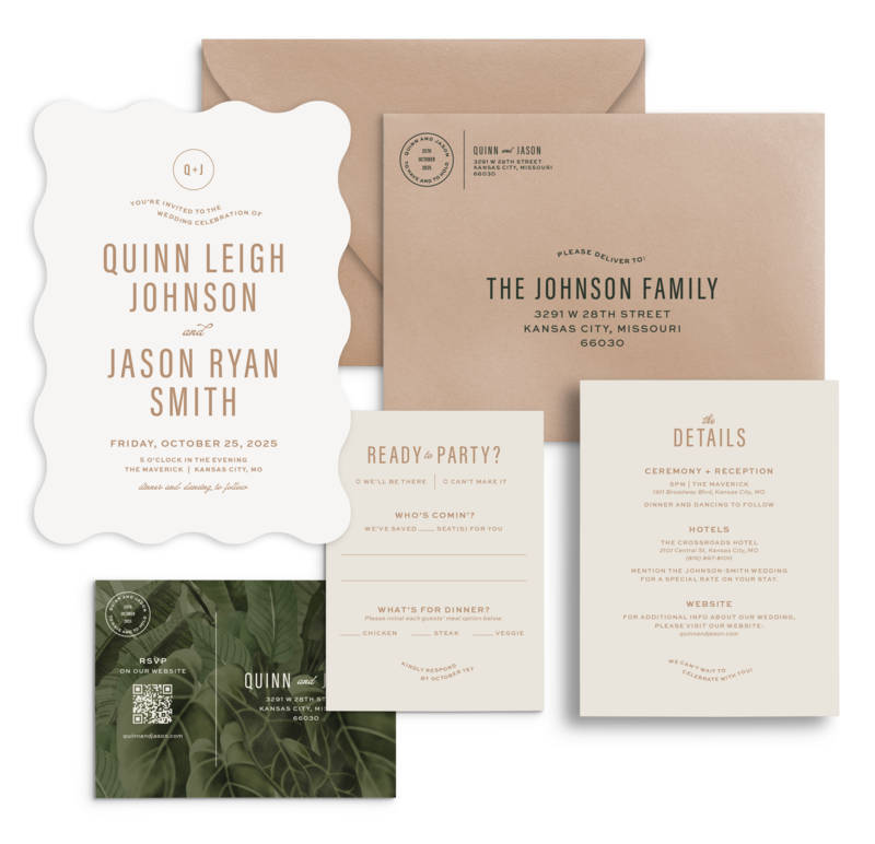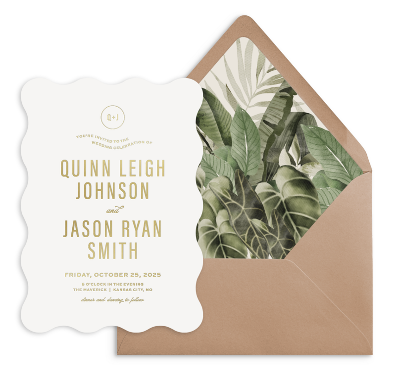 “Nalu” — meaning “wave” in Hawaiian — is the perfect name for this modern and creative design. This design incorporates playful design details, such as wavey text + shapes, which pair perfectly with the clean fonts used throughout the suite. Choose to customize your design with your wedding flowers or with tropical leaves like you see here! However you choose to customize your design, make it all your own!