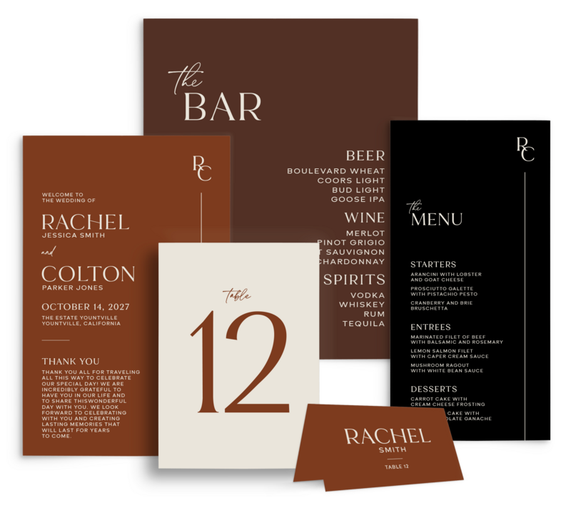 Photos and mockups of past E+W couples' wedding stationery and how they chose to customize the Terra design.